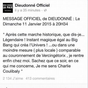 Le Figaro published this screenshot of a posting on Dieudonné’s Facebook page that apparently precipitated the arrest. It is dated 11 January, the day of the Paris march.