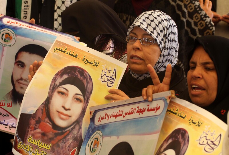 Palestinian women hold portrait of jailed compatriot Hana Shalabi, a female Palestinian prisoner jailed in Israel, outside the Red Cross building in Gaza City on March 26, 2012.