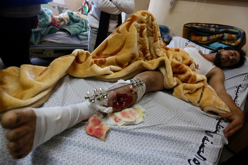 Muslih Sheikh Khalil, 24, is treated at Gaza City’s al-Shifa hospital for an injury caused by a bullet that fragmented in his leg. He is among 800 people injured when Israeli forces opened fire with live ammunition at Palestinians taking part in Land Day rallies along the Gaza-Israel boundary, 30 March. Sixteen Palestinians died by Israeli fire.
