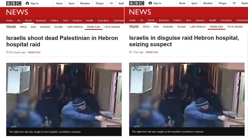 In a rare burst of reporting on an Israeli atrocity, the BBC ran an article on its website headlined: “Israelis shoot dead Palestinian in Hebron hospital raid.”