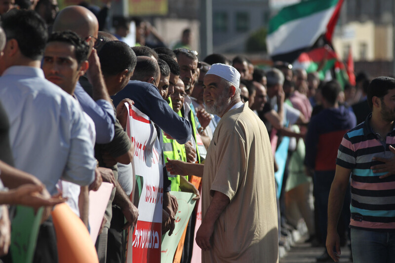 Raed Salah in 2014 leading Palestinian protests against suspected Jewish settler attacks on holy places for Muslims and Christians in present day Israel and the West Bank.