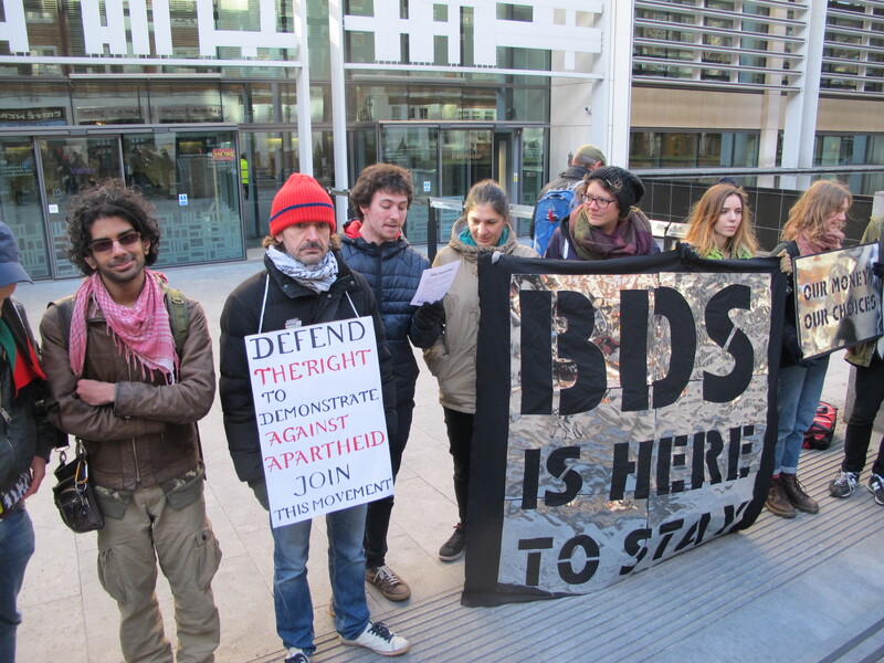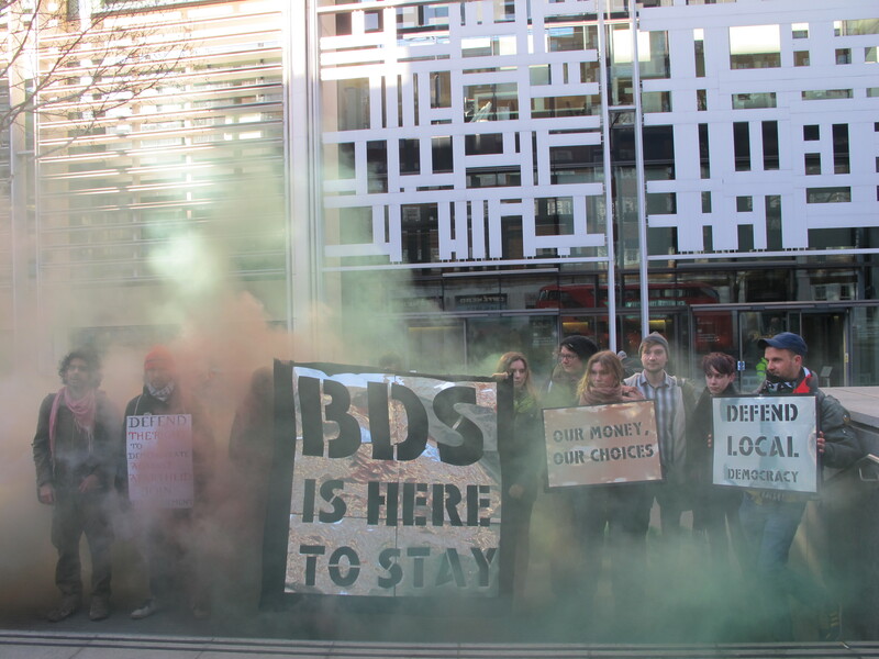 Activists in London on Monday morning protested a government department behind recent moves to curb ethical boycotts such as those aimed at Israel.