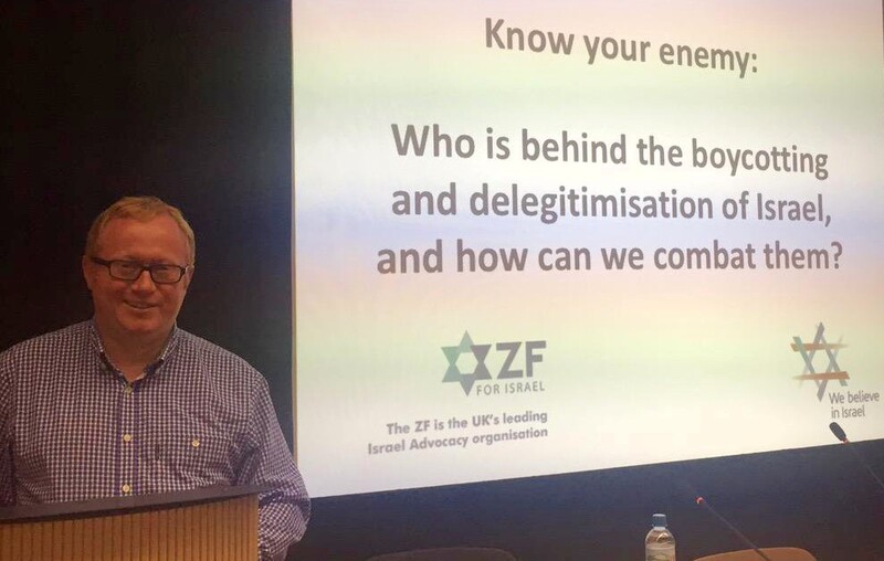 Luke Akehurst running a presentation on how to “combat” Palestine solidarity activists, the “enemy.” The former arms industry spin doctor is running for a seat on Labour’s ruling body this summer. (Zionist Federation/Twitter)
