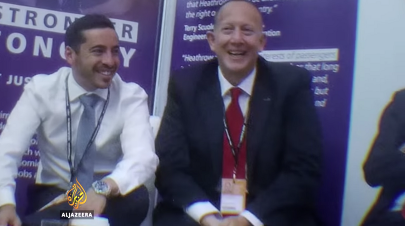 A still from Al Jazeera’s The Lobby shows Jewish Labour Movement chair Jeremy Newmark, right, with Shai Masot, the Israeli embassy officer caught plotting to “take down” a senior UK government minister.