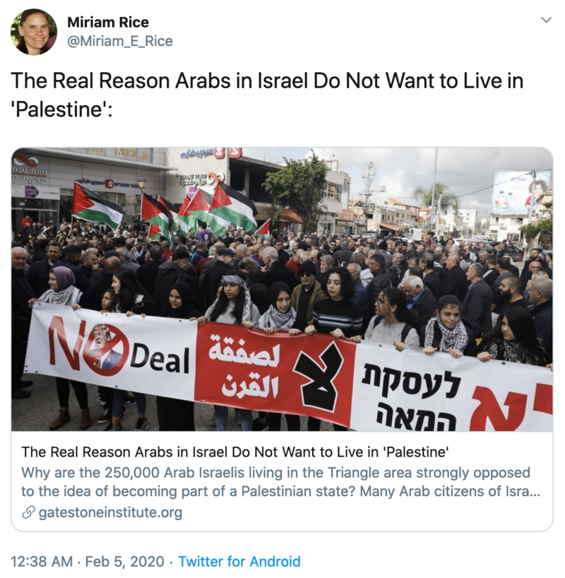 The article attacked Palestinian citizens of Israel for their opposition to Trump’s recent “Peace to Prosperity” plan, which could potentially displace many of them if implemented.