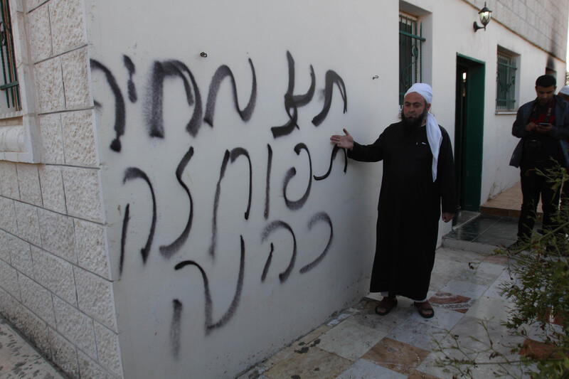Graffiti left by Israeli settlers after a 2014 firebomb attack on a Palestinian mosque claims it as a “price tag” in the name of Meir Kahane. The Jewish extremist rabbi died in 1990.