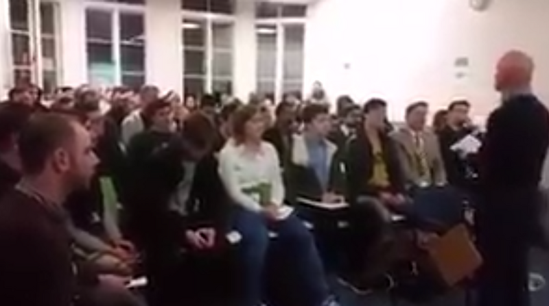 Still from a video posted online by the Israel society at the London School of Economics shows the former head of Israel’s secret police lecturing a room to which critical students were denied entry, while fire alarms go off.