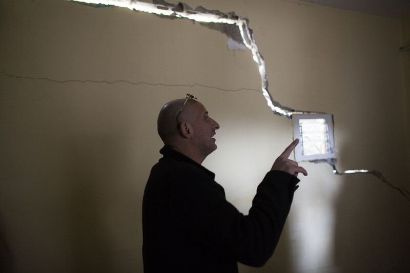 A man examines damage done to the home of a Palestinian family, from digging work at the settler-run “City of David” archaeological site, in the occupied East Jerusalem neighborhood of Silwan, 12 April.