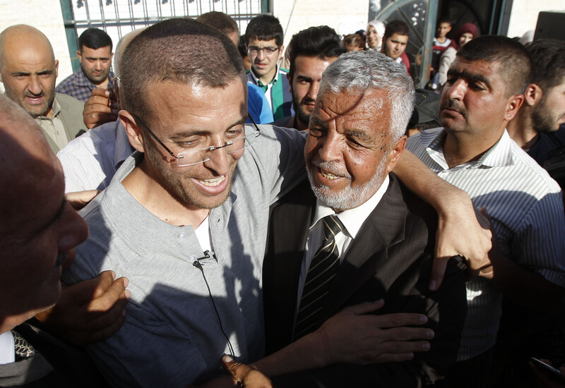 Palestinian journalist Muhammad al-Qiq is embraced by his father in the southern West Bank village of Dura upon his release from Israeli prison on 19 May 2016. The 34-year-old nearly lost his life during a 94-day hunger strike in protest of his detention without charge or trial after Israeli forces arrested him at his home in the West Bank city of Ramallah in November 2015.