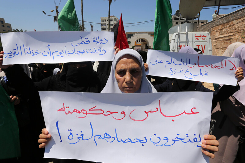 A Palestinian woman at a rally in Gaza City on 18 June carries a sign criticizing PA leader Mahmoud Abbas for supporting Israel’s blockade of Gaza.