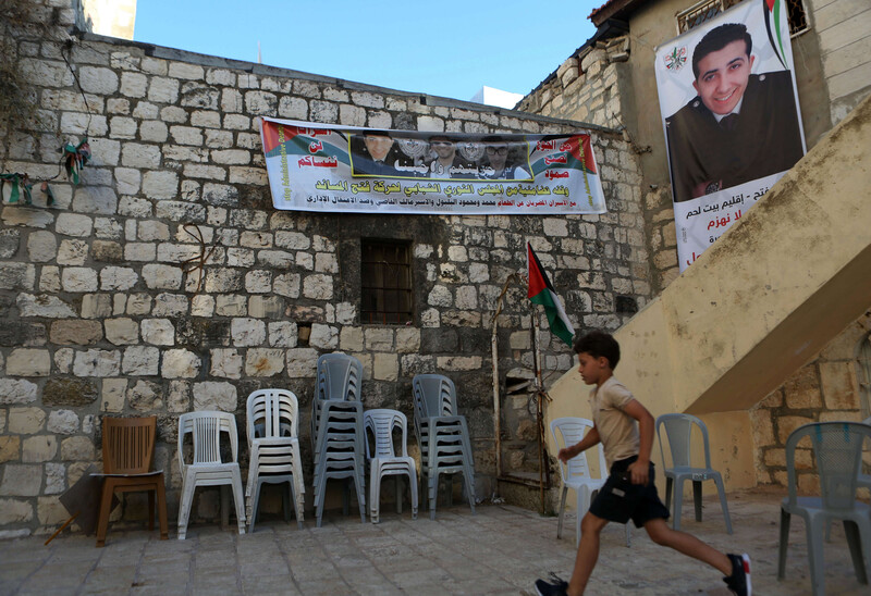 A boy runs in front of posters picturing hunger striking prisoners Muhammad and Mahmoud Balboul, in Bethlehem, 20 September.