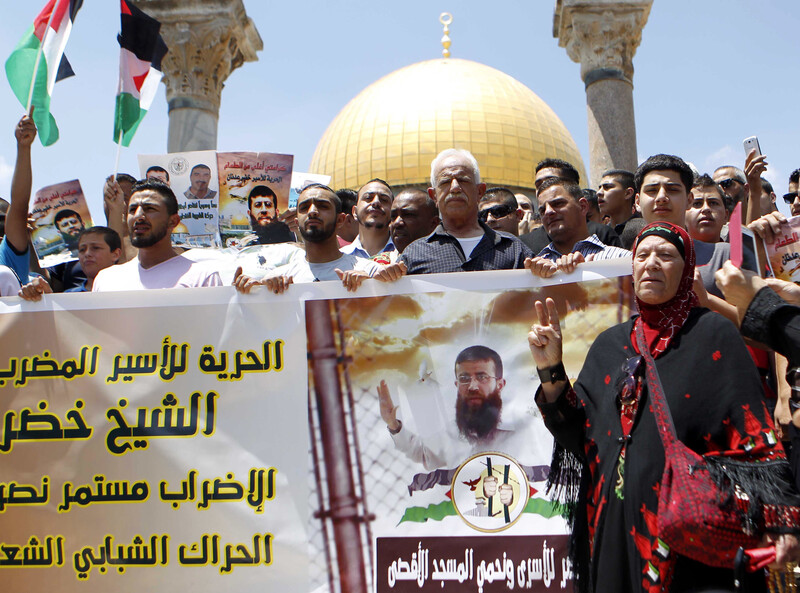 Palestinians in Jerusalem protest against the internment without charge of Khader Adnan, who is on hunger strike again.