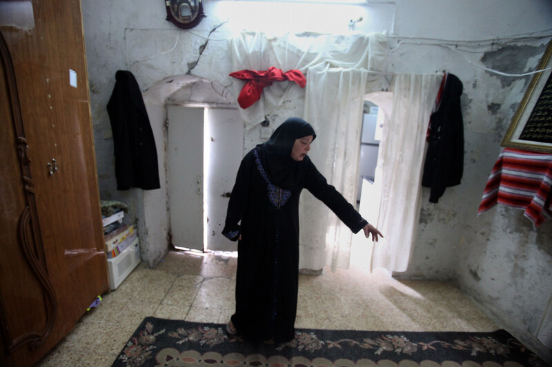 A Palestinian woman gestures towards cracks in a wall at her home in the Old City of Jerusalem, caused by excavations carried out by Israeli occupation authorities, endangering homes in the area.