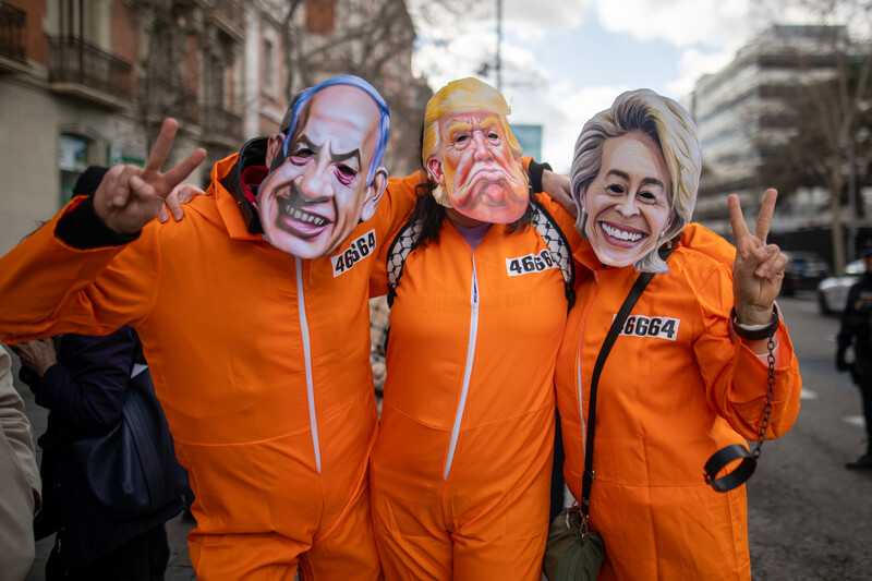 Protesters pretending to be Benjamin Netanyahu, Donald Trump and Ursula von der Leyen. (David Canales / ZUMA Press)