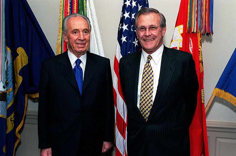 Kindred spirits: Shimon Peres meets fellow war criminal Donald Rumsfeld.