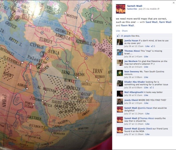 On July 25, Wadi, a young Palestinian-American restaurant owner and an acclaimed chef who has appeared on Food Network’s TV program Iron Chef America, took a photo of what he believed to be a historic, pre-1948 globe-map of Palestine and posted it on his personal Facebook wall. Wadi inscribed his wall-post with the comment, “we need more world maps that are correct, such as this one!” The next day, someone commented on the post, “This ‘map’ is missing Israel…,” to which Wadi replied “exactly the way that is should be” [sic].