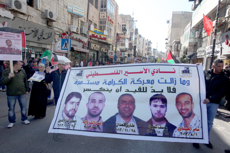 Palestinians in the West Bank city of Ramallah demonstrate in support of hunger striking prisoners, 3 January. Pictured in the banner (from left): Jafar Azzidine, Ayman Sharawna, Tarek Qa’adan, Yousef Shaaban, Samer Issawi.