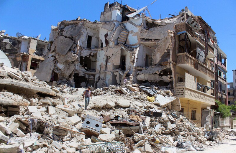 A Syrian boy climbs the rubble of buildings destroyed by Syrian government forces in the Ansari neighborhood of the northern city of Aleppo on 1 August.