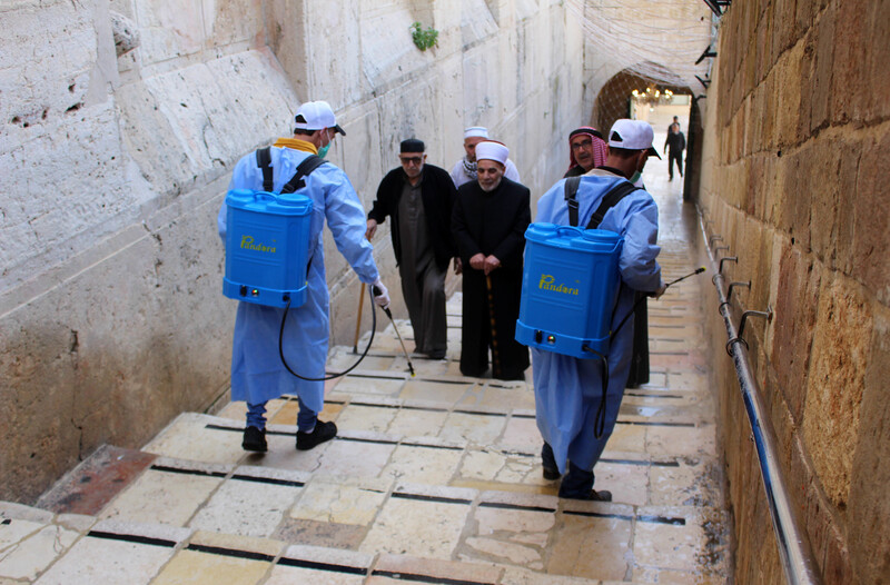 Palestinian workers disinfect an alley near the Ibrahimi mosque in the West Bank city of Hebron on 11 March.