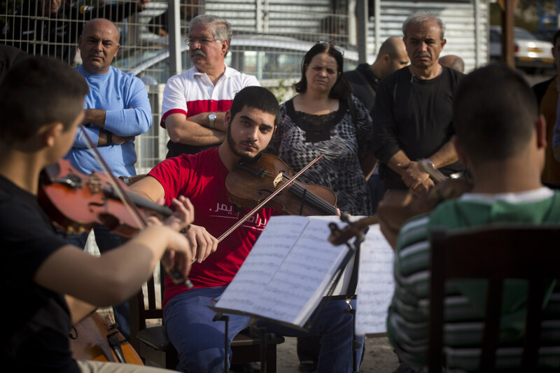 Omar Saad and family members perform outside the Israeli military induction center in Tiberias, 4 December.