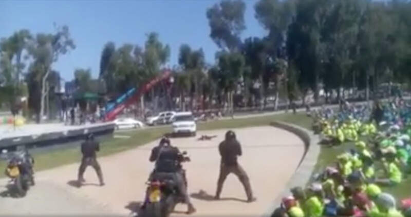 The video, uploaded to Facebook by a parent who attended the event, shows four officers riding on two motorcycles – one officer operating the bike, the other shooting from the back at a mock assailant who falls to the ground.The officers shooting from the bikes dismount and fire multiple times at the prone mock assailant. They are soon joined by the officers who were driving the motorcycles, who also shoot at the man lying on the ground.