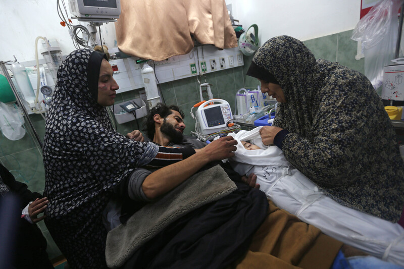 Palestinian mourn a child at al-Najjar hospital in Rafah, southern Gaza, on 19 December 2023. More than two dozen people, including journalist Adel Zoroub, were killed in Israeli airstrikes that destroyed three residential buildings in Rafah.