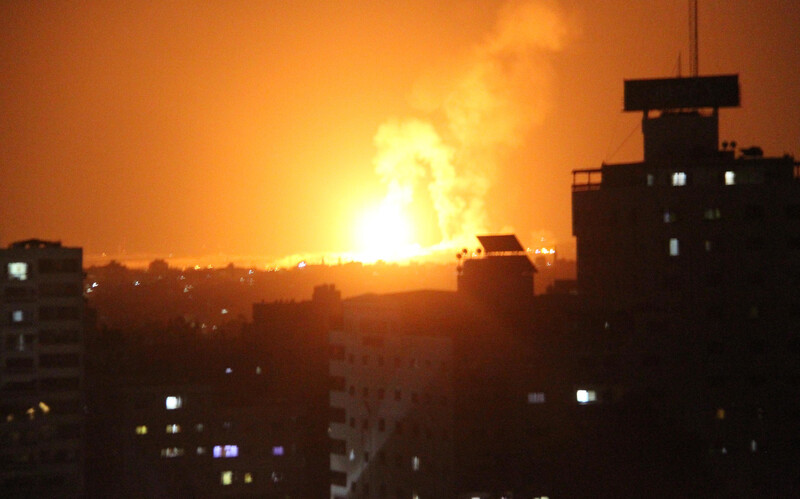 A fireball explodes over Gaza City during Israeli bombing on 8 August.