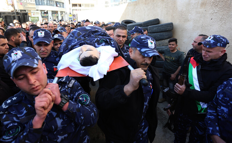 Palestinian police carry the body of their colleague Tariq Badwan, killed by Israeli soldiers, during his funeral in the West Bank city of Jenin on 6 February.