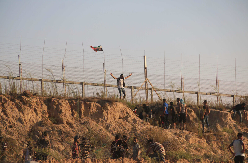 Palestinians gather at the militarized fence along the Gaza-Israel boundary during protests east of Bureij, central Gaza Strip, on 10 August.