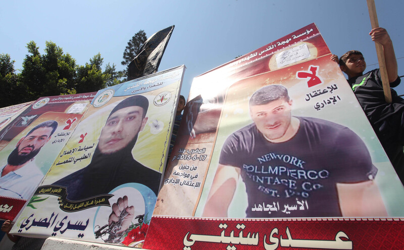 Palestinians in Gaza City rally in solidarity with prisoners on 22 July. Muhammad Allan is shown in the poster on the far left and Uday Isteiti in the banner on the right.