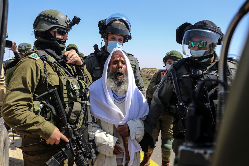 Haj Suleiman Hathaleen confronts Israeli soldiers during a rally against expropriation of Palestinian land for the expansion of Carmel settlement near Yatta village in the West Bank’s South Hebron Hills, March 2021.