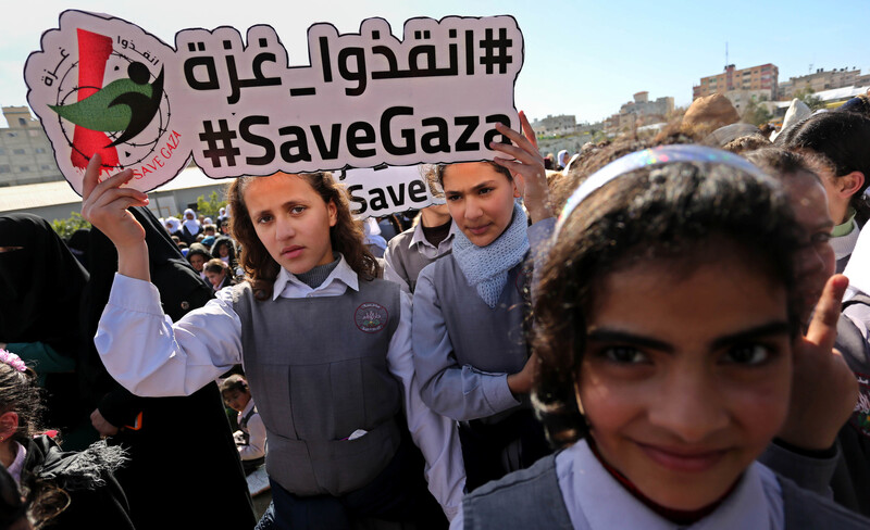 Palestinian pupils protest Israel’s blockade in Gaza city in February 2018.