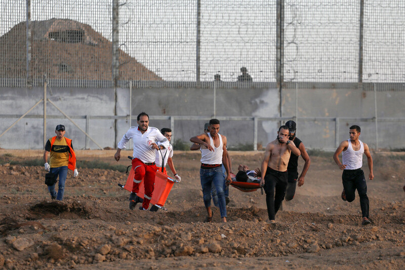 Palestinians carry an injured protester during a Great March of Return protest along the Gaza-Israel boundary in October 2019.