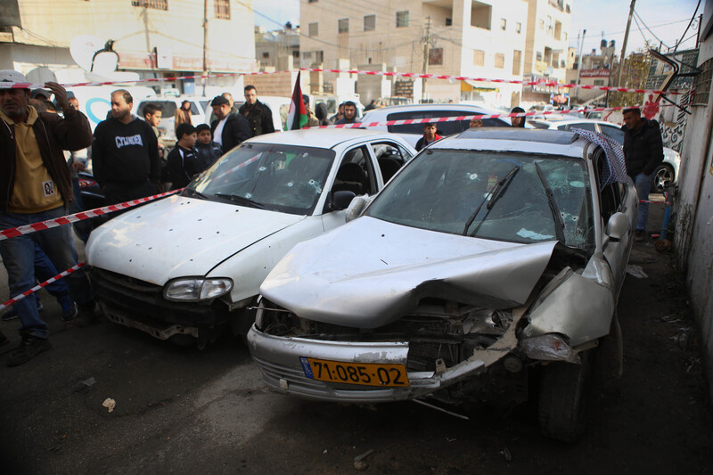 Palestinians stand next to two cars used by Palestinians in alleged efforts to run over Israeli soldiers storming Qalandiya refugee camp on 16 December.
