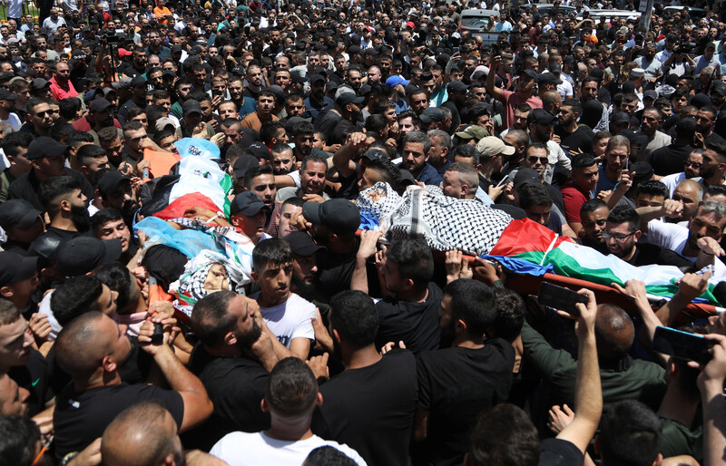 Palestinians carry the bodies of two Palestinians killed by Israeli troops in Nablus, 7 July.
