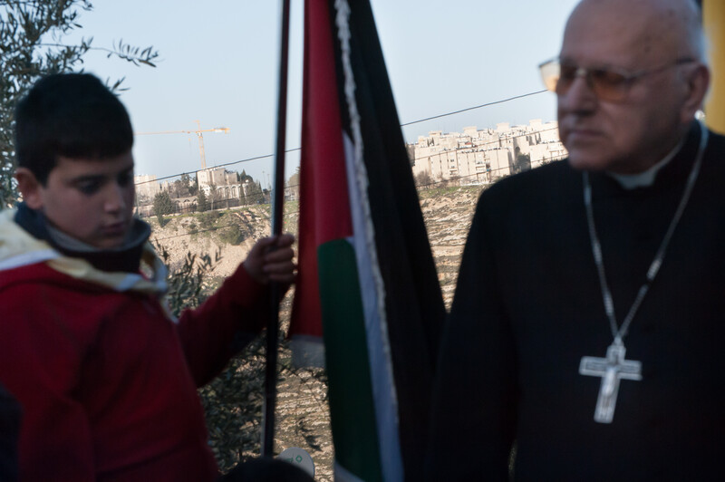 An Israeli settlement is seen in the background as Palestinians hold a prayer service in protest of Israel’s plans to build a wall cutting off the Cremisan monastery and agricultural land from a Bethlehem-area village, February 2013.