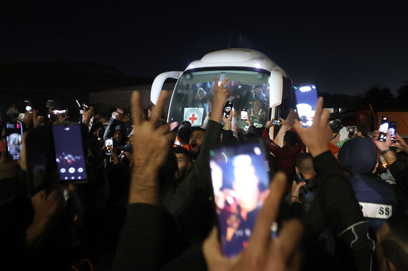 A crowd receiving some of the released prisoners chanted in support of Abu Obeida, the spokesperson for the armed wing of Hamas, and its head Muhammad Deif, thanking the resistance in Gaza for securing their freedom: