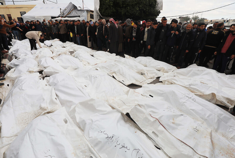 Palestinians attend a funeral at the Al-Aqsa Martyrs Hospital for 70 people killed in Israeli airstrikes on a residential area in al-Maghazi refugee camp in Deir al-Balah, central Gaza, 25 December.