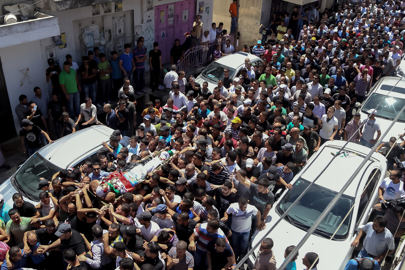 Mourners carry the body of teenager Mohammad al-Araj, killed by Israeli fire during a massive demonstration at Qalandiya checkpoint, during his funeral in Qalandiya refugee camp near the West Bank city of Ramallah on 25 July.