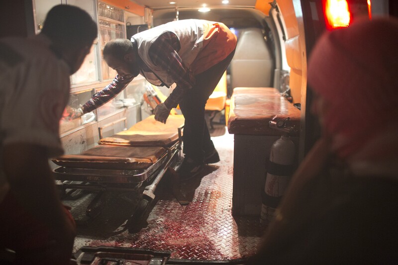 A medic cleans up blood inside an ambulance during clashes following a protest at the Qalandyia checkpoint.