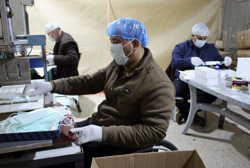 Palestinian workers assemble face masks at a factory in the West Bank city of Hebron on 14 March.