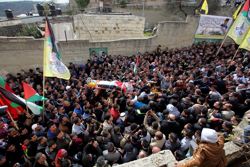 Mourners carry the body of Amjad Sukkari during the man’s funeral on 1 February, a day after he opened fire on Israeli soldiers and was shot dead at a checkpoint near Ramallah.