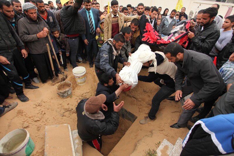 Mourners bury the body of Isra Abu Khusa, 6, during the girl’s funeral in Beit Lahiya, northern Gaza Strip, on 12 March. The girl was killed along with her brother in an Israeli air strike.