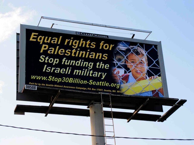 Seattle Mideast Awareness Campaign (SeaMAC) has launched a billboard campaign as part of a continuing effort to expose the misuse of U.S. taxpayer money to support Israel’s ongoing discrimination against the Palestinian people.