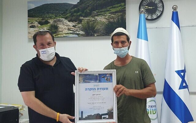 A photo published by Israeli media shows Eitan Ze’ev (right) receiving an award from the head of a regional settlement council.