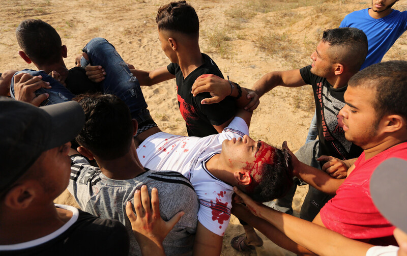 A wounded Palestinian protester is evacuated after being injured by Israeli fire near Gaza’s boundary with Israel, 21 July.