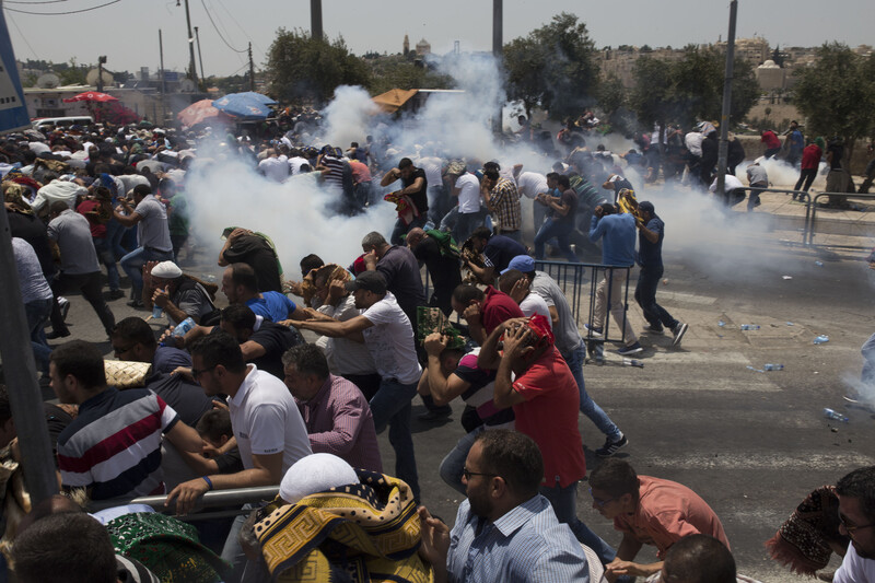 Israeli forces disperse Palestinian worshippers in the Ras al-Amoud neighborhood of Jerusalem after mass prayers were held in the streets in protest of Israeli measures at al-Aqsa mosque, 21 July.