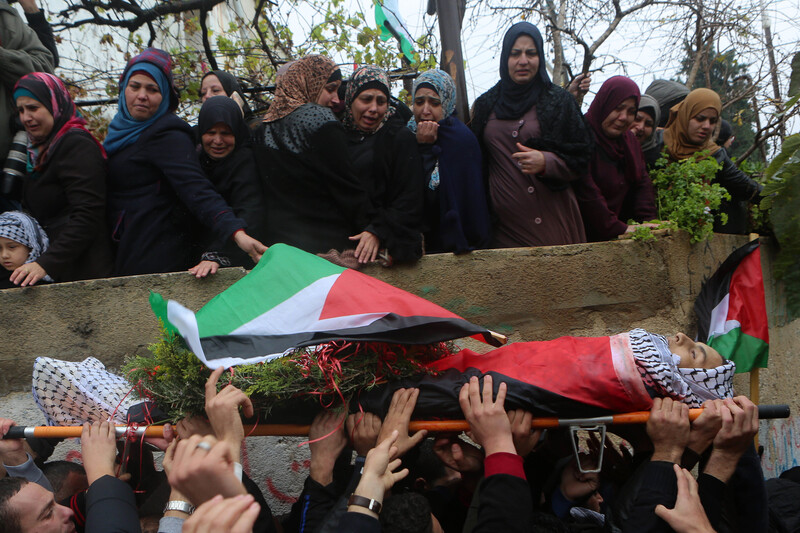 Mourners carry the body of Firas Khadour during his funeral in the West Bank village of Bani Naim on 17 December.