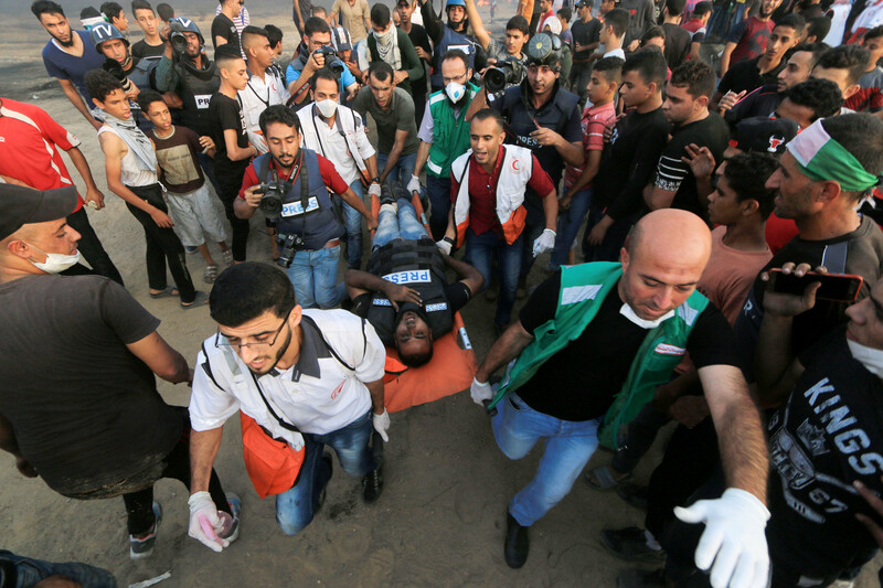 A wounded journalist is evacuated during protests east of al-Bureij, central Gaza Strip, on 19 October.