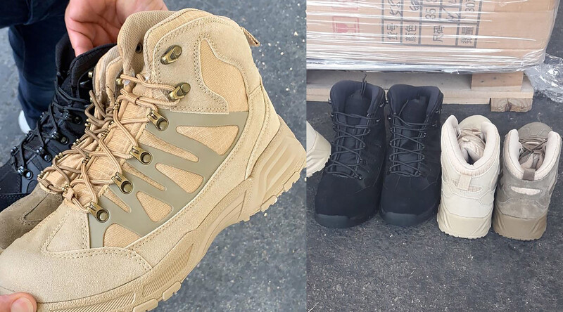One of the tweets features a photo of a man holding three lace-up hiking boots. COGAT states that the shoes “were hidden in a shipment of civilian goods, in an attempt to smuggle them into Gaza for terrorist purposes”: